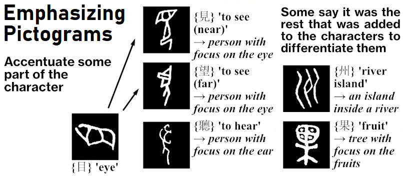 Emphasizing pictograms, well, emphasize something to denote a different meaning. This category mostly contains body parts and actions connected with them. They are very old too, and pretty much no new ones have been coined since the times of early writing.