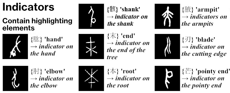 From pictograms we move on to a different type of semantograms. Indicators contain highlighting elements like circles, dots or lines that point to some specific part denoting what the character means. These are also pretty old.