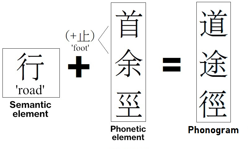 For example, you could write the word {道} ‘road’ using the characters composed of the semantic 行 ‘road’ and the phonetics 首 or 舀. The characters 首 and 舀 transcribe the words {首} ‘head’ and {搯} ‘to pull out’. This means that their definitions have nothing to do with the word {道} ‘road’ (unlike the semantic 行) but their pronunciation is similar.