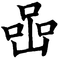 Either 口 MOUTH + shortened ♪坎 *KƏM or shortened form of 𲊩 (口 MOUTH + (distorted form of 𬔧 created for {贛} *kʰˤəmʔ “to bestow”)).