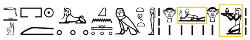 The picture above shows an example of the grouping of Egyptian hieroglyphs – the hieroglyph ⟨𓆑⟩ is located under the hieroglyph ⟨𓌬⟩, and “inside” the hieroglyph ⟨𓆓⟩ are ⟨𓏏⟩ and ⟨𓇿⟩. In Egyptian script, grouping is done only for the visual beauty of the text, but in the following example, it is meaningful.