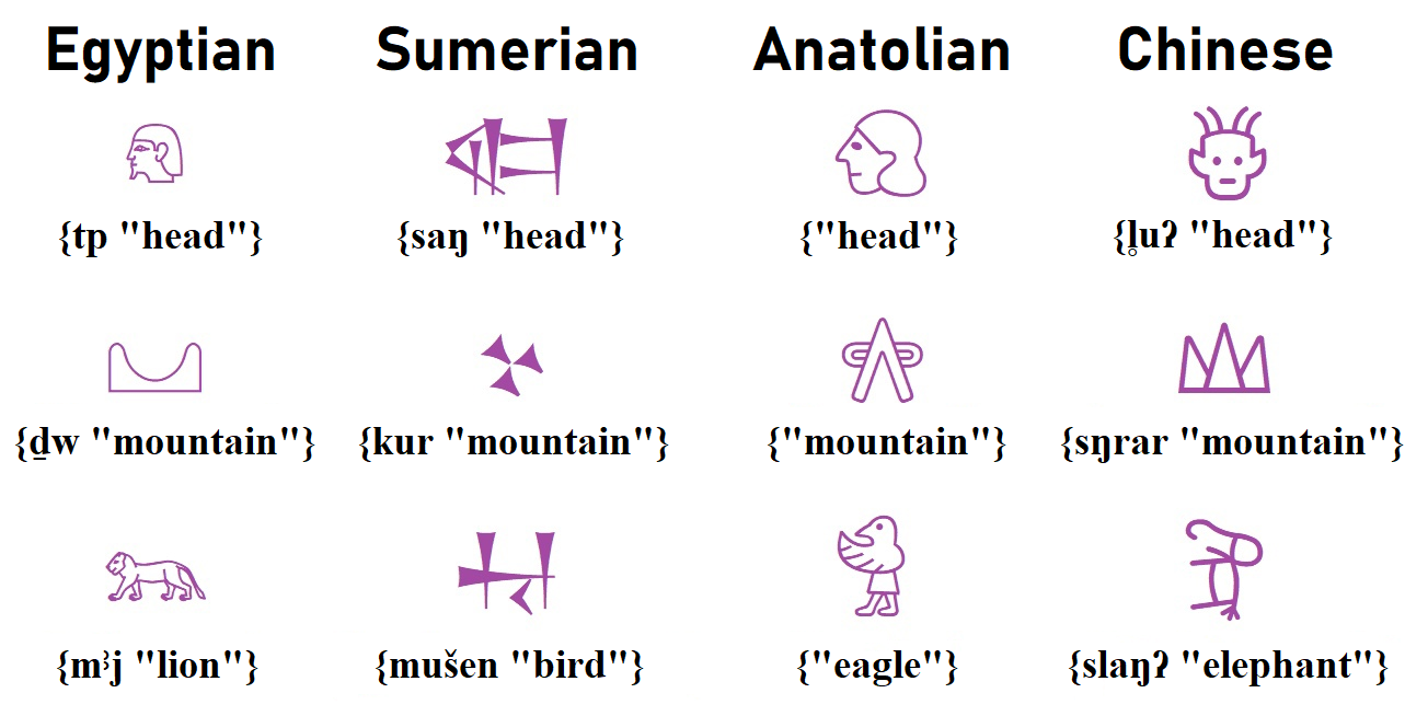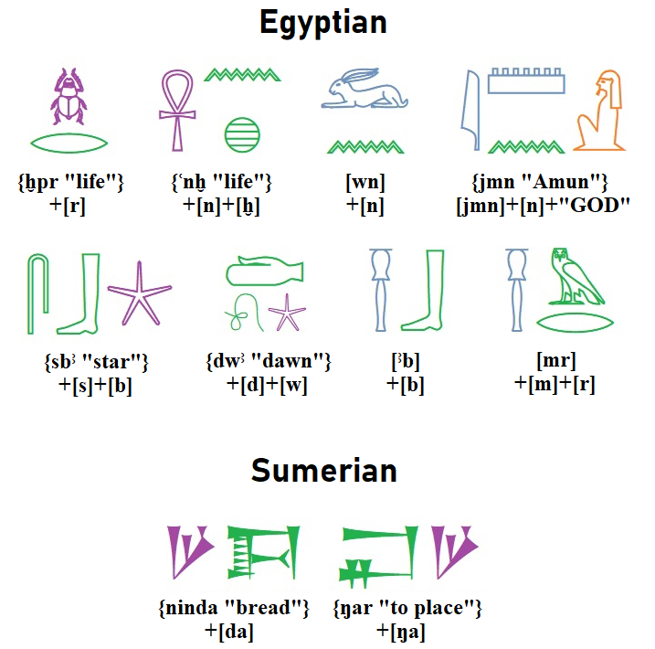 Phonograms: The Egyptian hieroglyph ⟨𓅓⟩ represents the sound [m]; the cuneiform sign ⟨𒈬⟩ represents the sound [mu]; the Anatolian hieroglyph ⟨𔗷⟩ represents the sound [a].