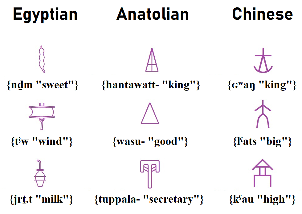 In Anatolian, the word {hantawatt- “king”} is conveyed by the image of a king’s hat, the word {wasu- “good”} by a triangle (symbol of happiness), and {tuppala- “secretary”} by a stone tablet with a chisel.