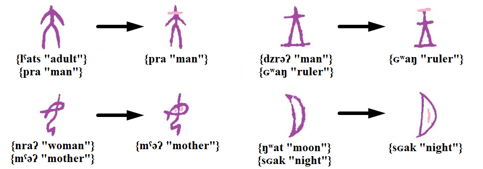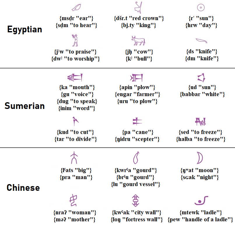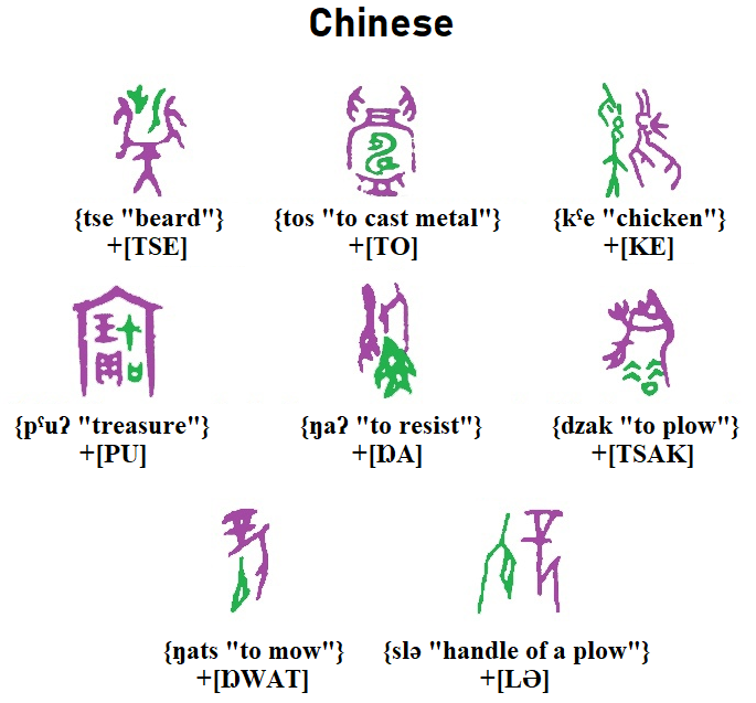 In Chinese, the word {ɢʷaŋ “king”} is conveyed by the image of an axe (symbol of the king’s power), the word {lˤats “big”} by the image of an adult, and {kˤau “high”} by the image of a tall building.