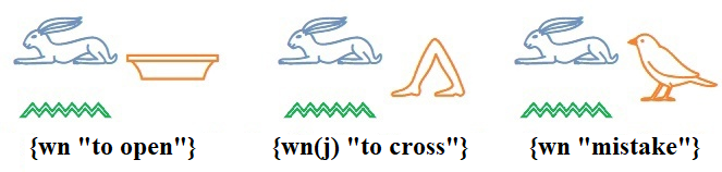 In all cases, the same groups are used, conveying the reading [wn], but the semantics are different in all cases: ⟨𓉿⟩ “DOOR”, ⟨𓂻⟩ “MOVEMENT” and ⟨𓅪⟩ “BAD”.