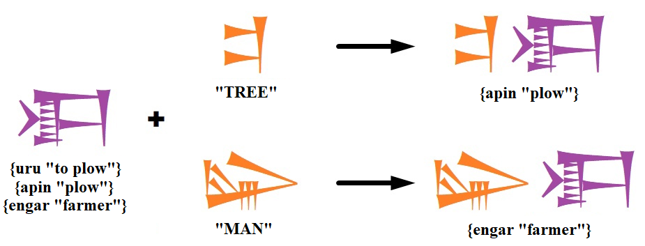 Also, they do not always exactly copy the reading of the original logogram, but can be used for phonetically similar variants. For example, the Sumerian logogram ⟨𒀭⟩ {an “heaven”} can write [an] and [am], and ⟨𒈬⟩ {mu “name”} can write [mu] and [ŋu]. This is clearly seen in the example of Chinese script – for example, the logogram ⟨石⟩ {dak “stone”} can phonetically write words like {tak “to pick up”}, {tˤaks “to be jealous”}, {staks “numerous”}, {tʰˤak “bag”}, {dˤaks “measure”}, etc., that is, as a phonogram it writes some general sound sequence [TAK].