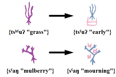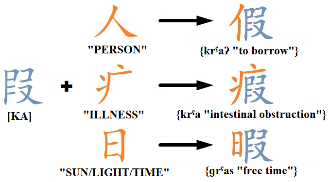 Chinese script is no exception. For example, the character ⟨叚⟩ had a phonetic value of [KA] and as a phonogram originally recorded words such as {krˤaʔ “to borrow”}, {krˤa “intestinal obstruction”}, {ɡrˤas “free time”}. Later, semantics were added to it: