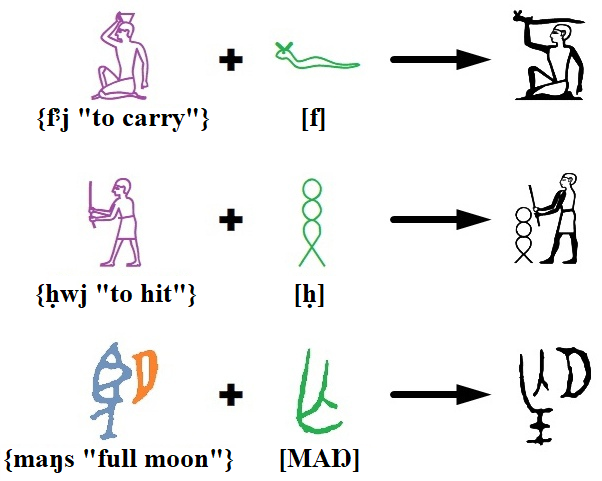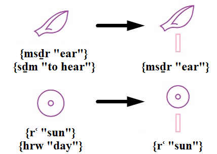 In Egyptian, the word {nḏm “sweet”} is conveyed by the image of carob beans, the word {ṯꜣw “wind”} by the image of a sail, and {jrṯ.t “milk”} by a bottle of milk.