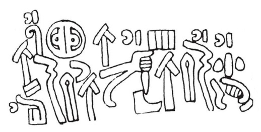 Actually, the language is not fully transmitted here, thus it is still a proto-writing. The only non-ideographic symbols here are (1) the phonogram for the word “white” (above the “wind on the left”), derived from the logogram for the word “to unite”; (2) the logogram for the word “black” (above the “wind on the right”); (3) the logogram for the word “cliff”, supplemented by (4) a phonetic, derived from the logogram for the word “chicken”, depicting a chicken head.