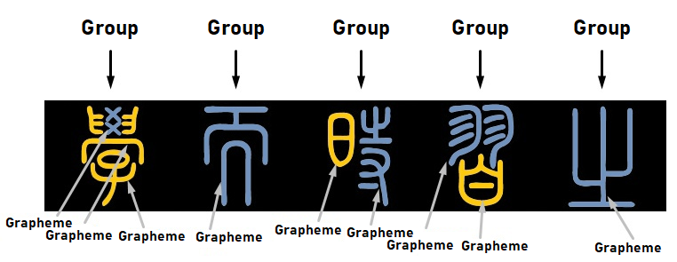 For convenience, characters consisting of one symbol should also be understood as groups, since in the context of Chinese script, a group = a character, and it consists of graphemes, i.e., in groups consisting of a single grapheme: grapheme = character = group.