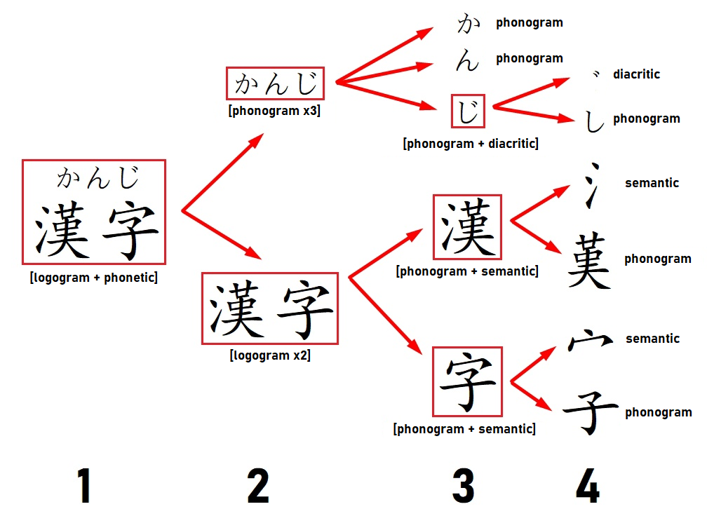 Here the word {kanji “Chinese character”} is written using the symbols ⟨漢字⟩, the reading of which is written above in phonetic symbols as ⟨かんじ⟩. This entire combination can be considered one large group representing one word. In this group, however, it is possible to distinguish subgroups, and in them even smaller elements can be distinguished (how small – is decided by whether we want to give a synchronic or diachronic description). Below is a hierarchy of groups (highlighted in red) with a description according to the modern systematics (see below):